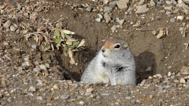 Vandaag kruisen géén beren ons pad, enkel een schattige grondeekhoorn laat zich gewillig fotograferen. Na amper 34 km stoppen we bij het Eielson Visitor Center, netjes gesloten “for the season” en bijna hermetisch dichtgetimmerd voor het aanstormende wintergeweld. Onder een luifel zetten we ons tentje op en genieten in T-shirt uit de wind in de laatste uurtjes zon. Die avond gaat het kwik flink onder nul en zijn we blij met onze winter slaapzak en extra fleece slaapzakje.