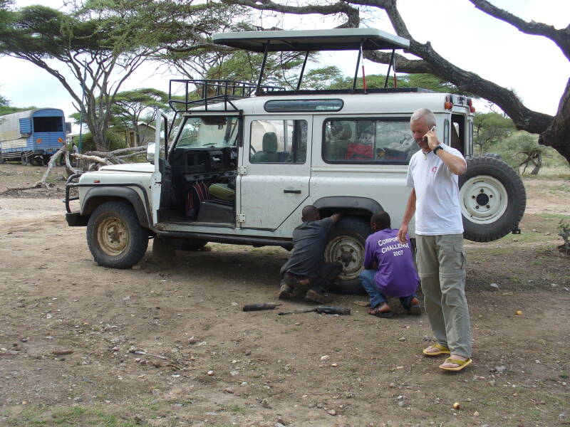 Tijdens de ochtend van de dag dat we omstreeks de middag het befaamde Serengeti national park uit moesten zijn, viel onze robuuste Landrover Defender (door mezelve ondertussen “onze trusty steed” ofte ons trouwe werkpaard genoemd) volledig onverwacht in een Tanzaniaanse panne. Pannes komen meestal onverwacht en nu was het niet anders. Plat op de buik onder de wagen want van daar ergens kwam een nogal verdacht en ongezond geluid en speurend naar een onderdeel dat ofwel weg was, ofwel in verwrongen of gespleten staat. Al snel kreeg ik de linkerachter schokdemper in het snotje en zag daar iets wat me niet echt zinde. Een kapotte amortisseur ! Terdju, wat nu ? Een 5 tal minuten later stopt er een gemotoriseerde inboorling en samen plaatsen we de twee losgekomen onderdelen terug in elkaar en kunnen we “pole, pole” verder rijden.