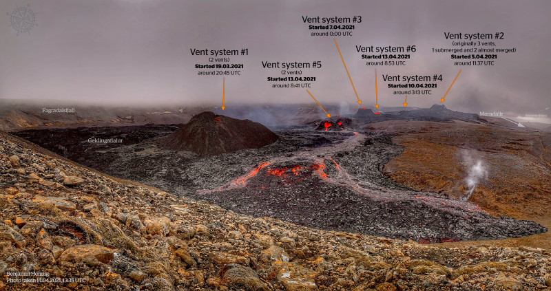 Dé hoofdreden voor deze vijfde IJslandreis ! Hoe vaak kun je een vulkaan zien uitbarsten ? Juist, zelden. Nu weten trouwe bezoekers van deze site wel dat we al het grote voorrecht hadden om op verschillende locaties in de wereld zwavel te snuiven en zelfs tweemaal de uitbarstingen op de Italiaanse Stromboli mochten meemaken. Maar een piepjonge babyvulkaan van jetje zien geven is natuurlijk van een andere orde. De foto hier net onder toont hoe de toestand was op 14 april '21. Toen waren er een zestal "vents" ofte uitstroom openingen die soms tegelijk of afzonderlijk lava spuwden. Uiteindelijk stopten alle vents en bleef enkel één krater lava spuwen. Dit ging in continu veranderende cycli en patronen. Toen wij er waren begon er ongeveer elke 10 à 15 minuten een lavastroompje uit de krater te stromen, aan te zwellen tot een grotere stroom om uiteindelijk te eindigen in een gigantische vloedgolf. Wij zaten samen met een aantal andere mensen op, ik schat één à anderhalve kilometer van de actieve krater en je kon gewoon de hitte voelen van op deze afstand !